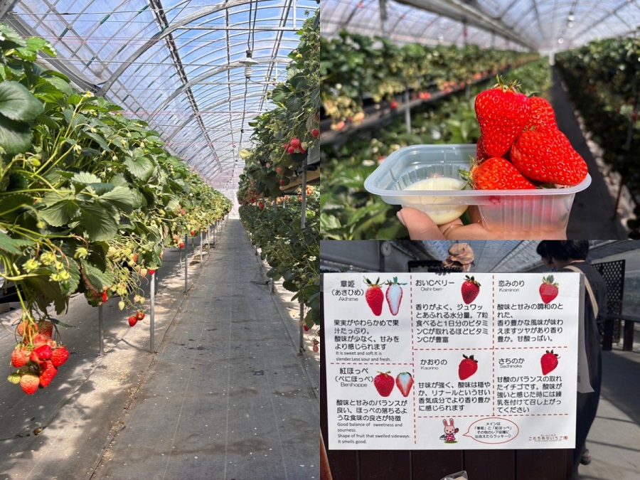 “紅ほっぺ”に“章姫”(あきひめ)とよく聞く品種はもちろんのこと“おいCベリー”や白いちごもあり初めて聞く品種もたくさんで何を食べようか迷ってしまいました。