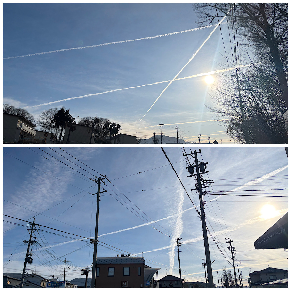 飛行機雲は空気が乾いているとすぐ消えてしまうそうなので、今日は空気中に水分が多いという事なのかな?冬で乾燥している感じがするけど…?と思いました。