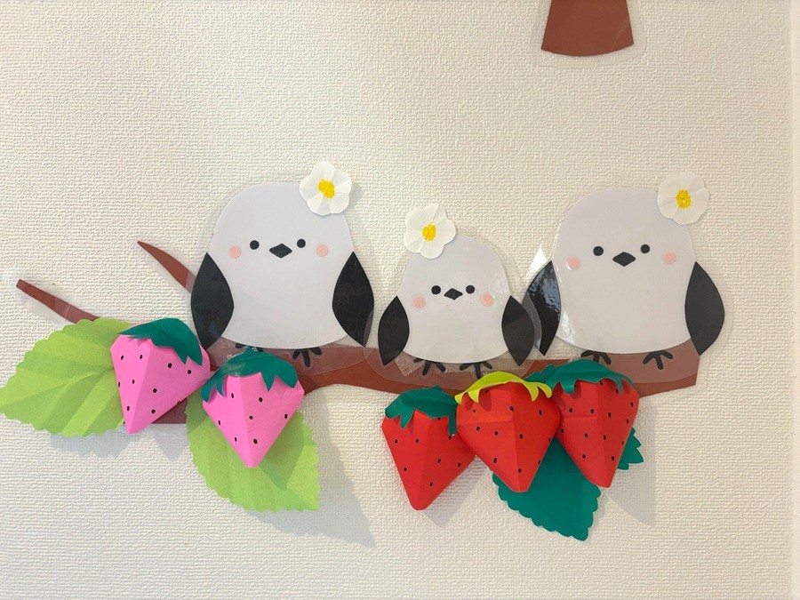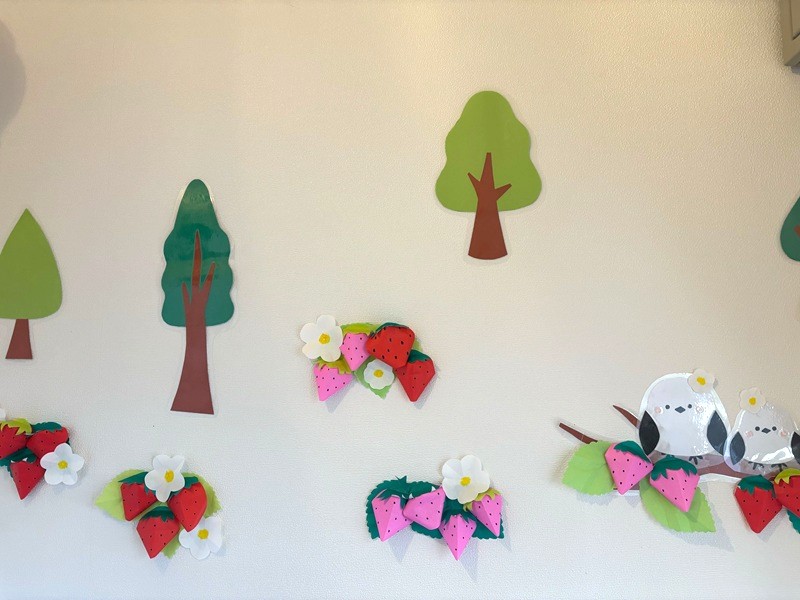 今回は、キッズスペースにあるままごとの中でいつも人気の【いちご】を飾りにしてみました。