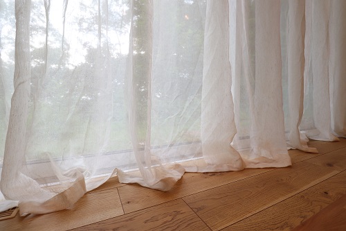 薄手の生地で作られ、日差しをやわらげ、外からの視線を遮りつつ、部屋に明るさを取り入れます。
