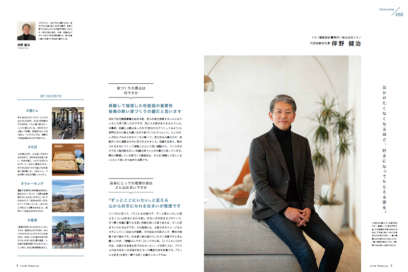 トモノの家づくりの原点、理想の住まい についてのお話や、趣味も紹介されています。