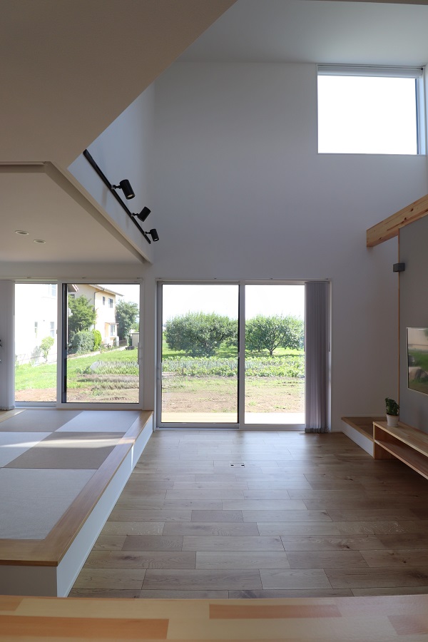 南北にある吹き抜けの窓は、1階にいる時は空が見え、2階にあがると遠くの景色や浅間山まで見渡せます。
