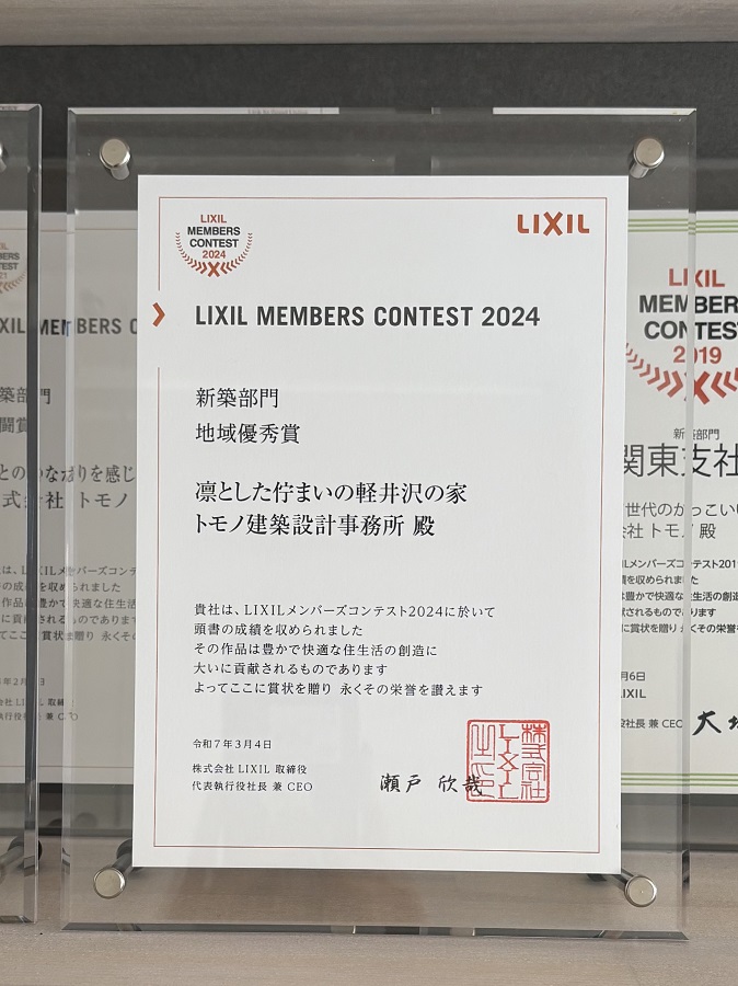 2024年のコンテストでは新築部門『地域優秀賞』を頂き、表彰盾が届きました。