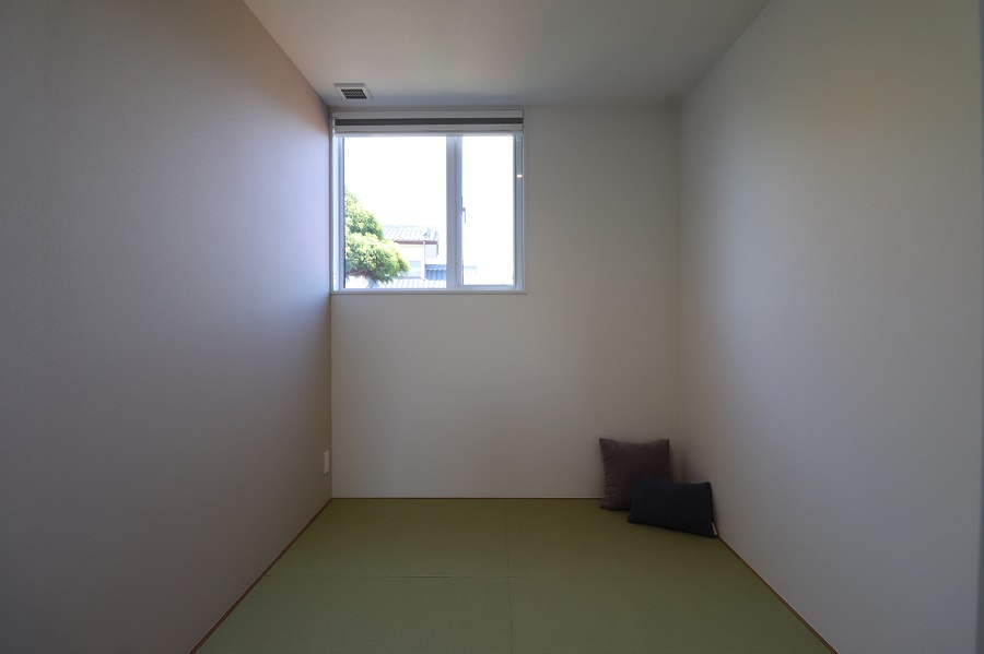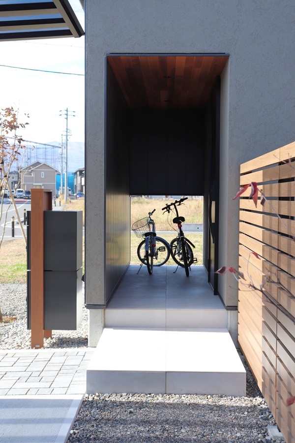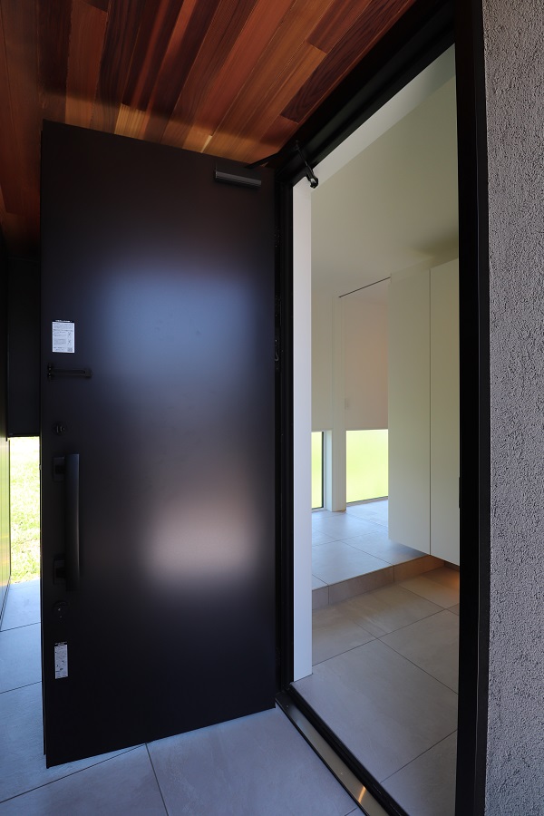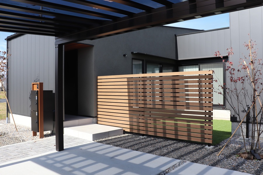 通りからの視線をさりげなく遮りつつ、光と風を心地よく取り込むレイアウトで、外と内のバランスを美しく整えたコの字型の住まいとなっています。