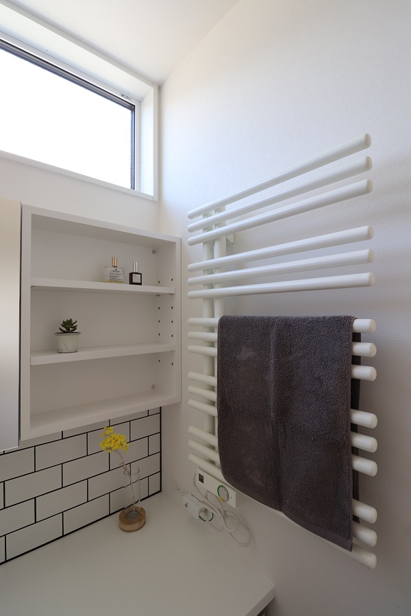 白い壁に調和するシンプルなデザインのタオルウォーマーを設置し、いつでもタオルを気持ちよく乾かせます。
