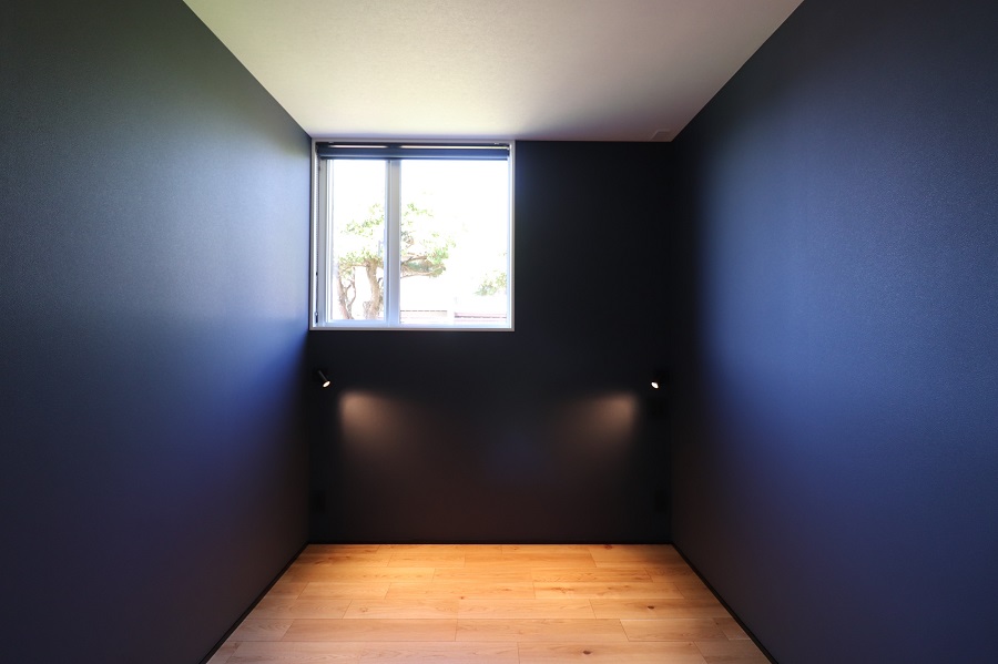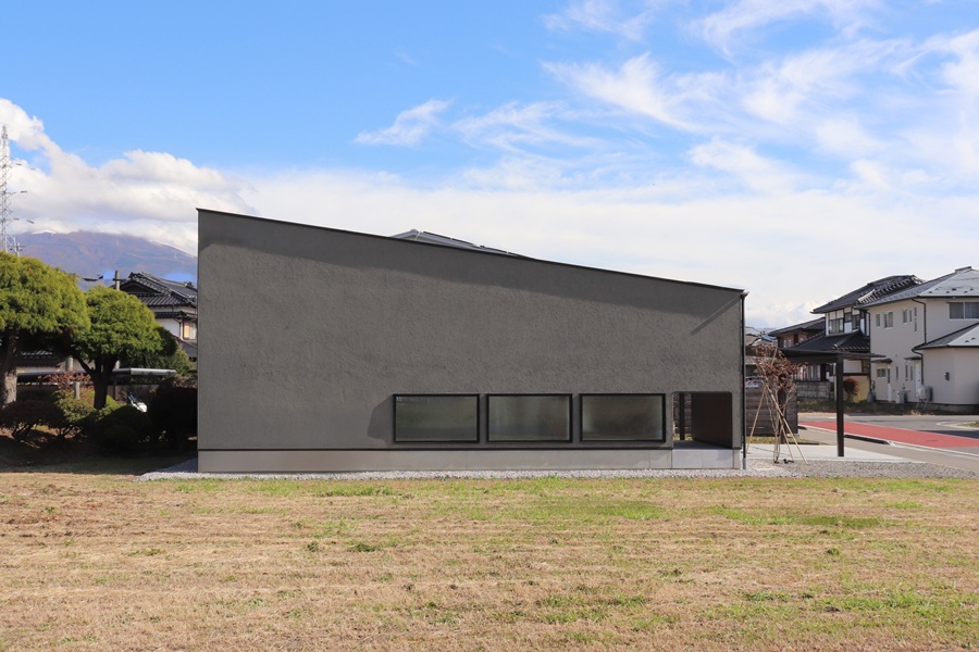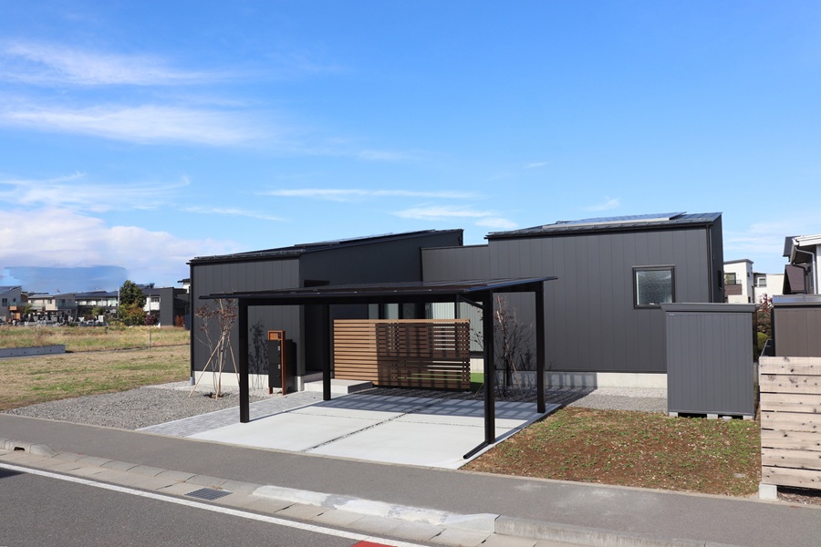 ガルバと塗り壁の2種類の外壁は、見る角度によって印象が変わる、シックでシャープな外観デザイン。