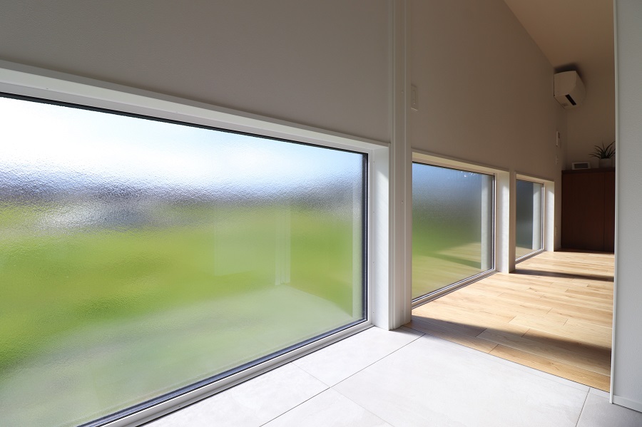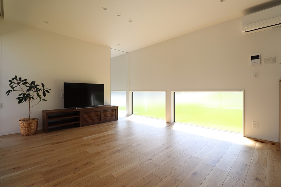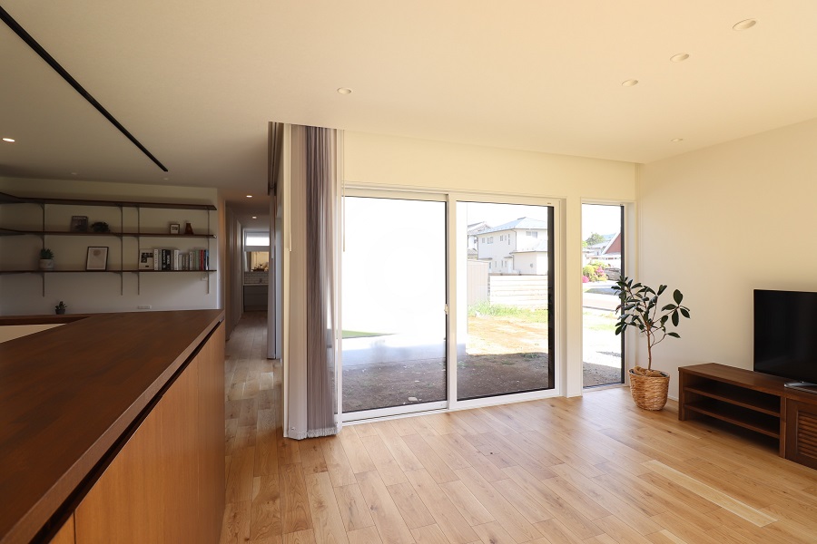 地窓からやわらかな光が広がる、穏やかな空気感のリビング。