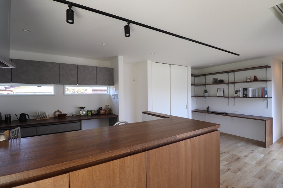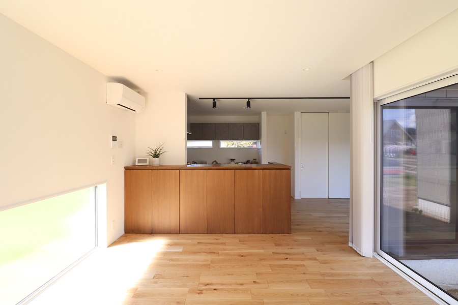 隣接するキッチンや書棚とのつながりが、家族の動きを自然につなぐ、穏やかで暮らしやすいLDKです。
