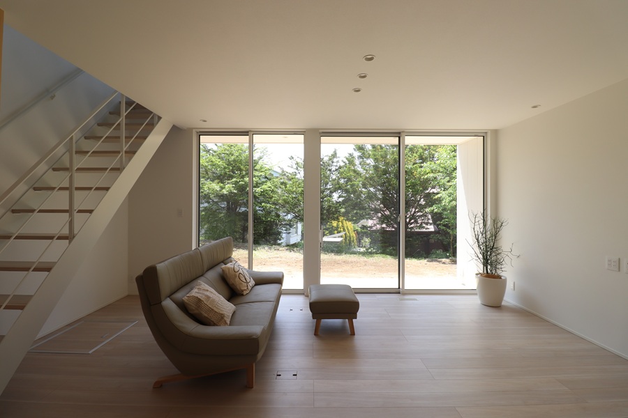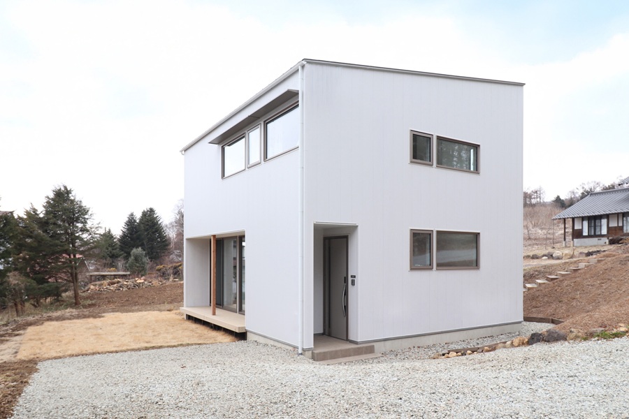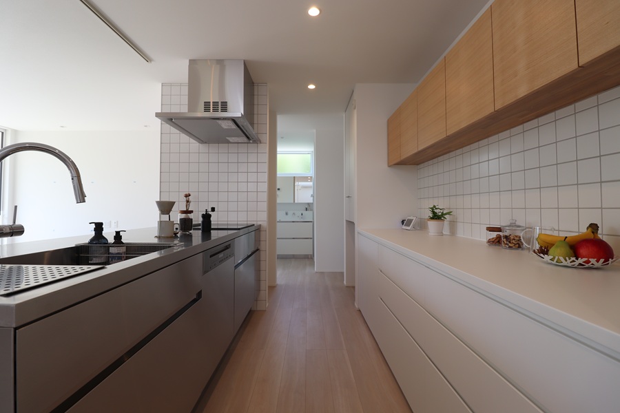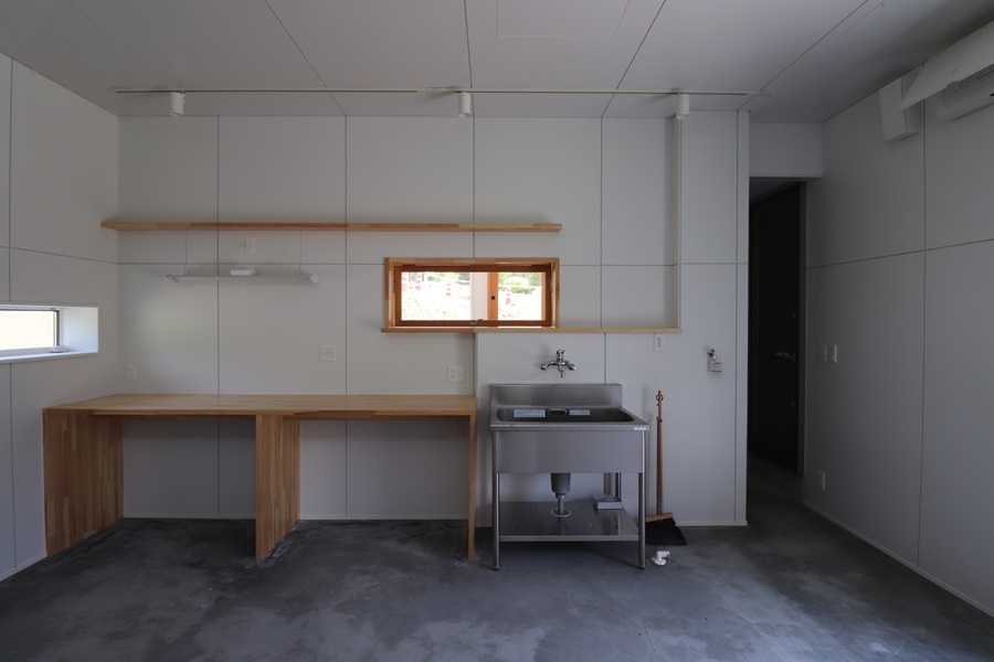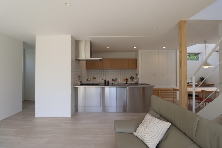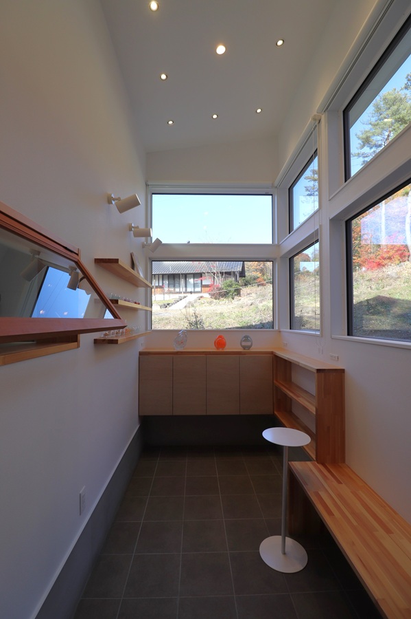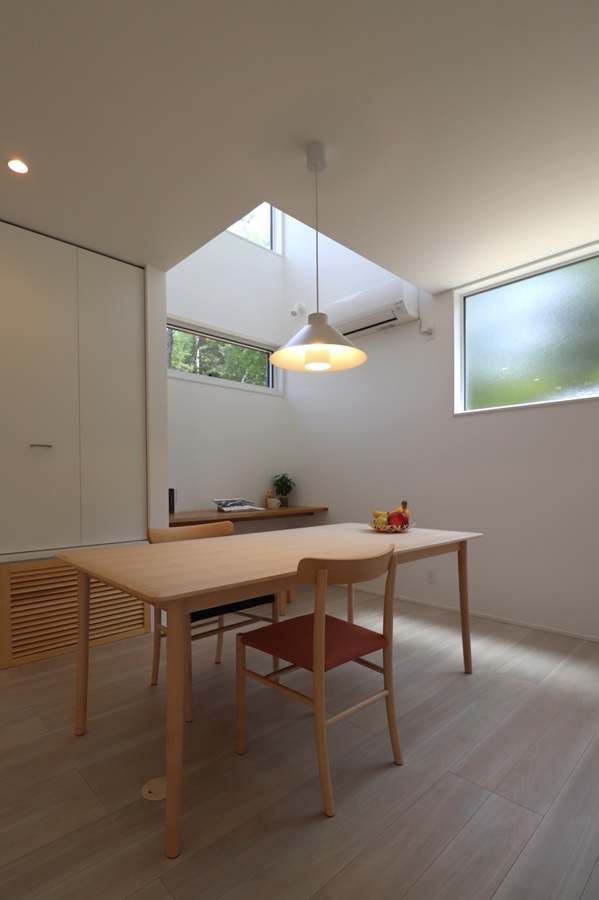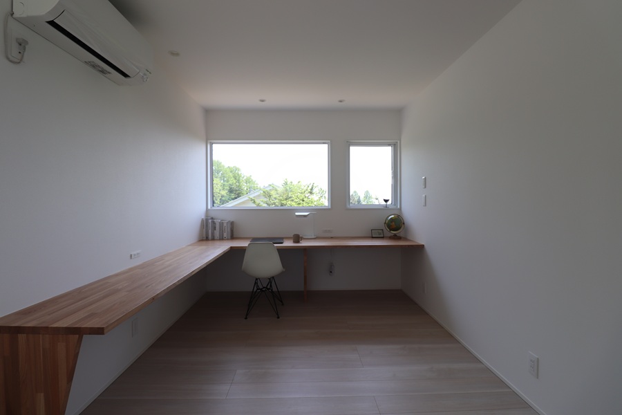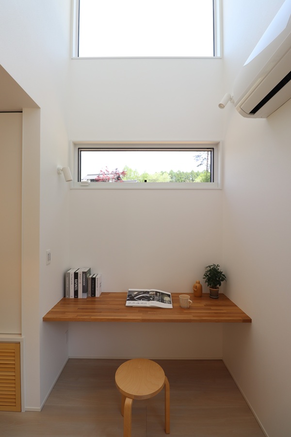 ガラス工房&ショップの店舗併用住宅です。 住宅部分は、直線的でボリューム感のある2階建ての構成です。 平屋の店舗部分が、建物のデザインにリズムを与えています。 造作や既製品をうまく組み合わせたシンプルでスッキリデザインのお家です。 【LDK】 空間全体は、白を基調とした明るい木目のフロアで統一され、連続窓が広がりを感じさせます。 奥にはキッチンとダイニングスペースが配置されており、アイランド型のキッチンカウンターがリビングとの緩やかな仕切りとなっています。 オールステンレスのキッチンは、清潔感があり洗練された印象を与えます。 【スタディスペース】 吹き抜けと高窓から降り注ぐ自然光を最大限に活用し、シンプルで温かみのある素材で仕上げています。 宿題やPC作業などが行える多目的な空間です。 【2階仕事部屋】 部屋の壁一面に渡って、L字型のカウンターデスクを設置しました。 広いワークスペースは、PC作業や書類整理など、複数の作業を同時に行うことができ、デスク周りを常にすっきりと保てます。 デスクの正面には、横長の連続窓を配置し、目線と同じ高さに外部の豊かな緑や遠くの景色を取り込み、作業の合間にリフレッシュできる開放的な眺望を確保しました。