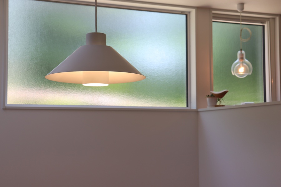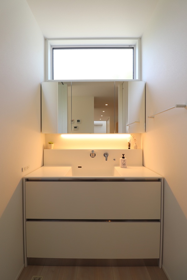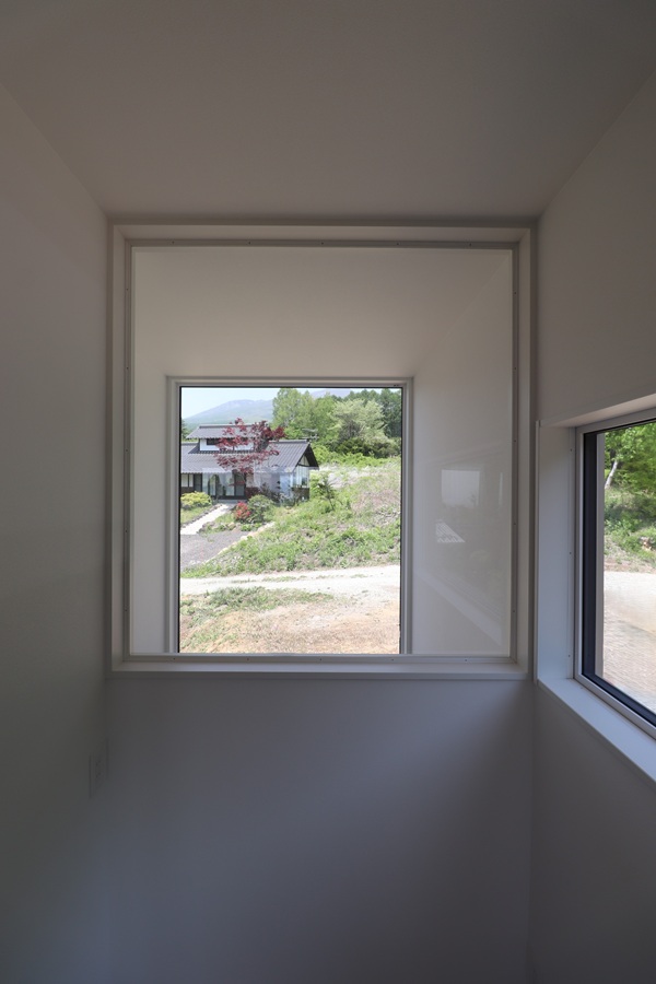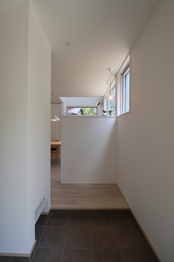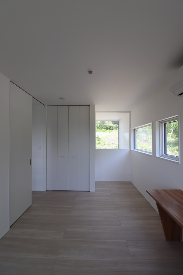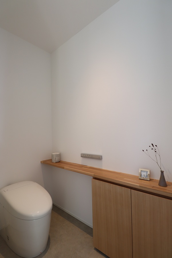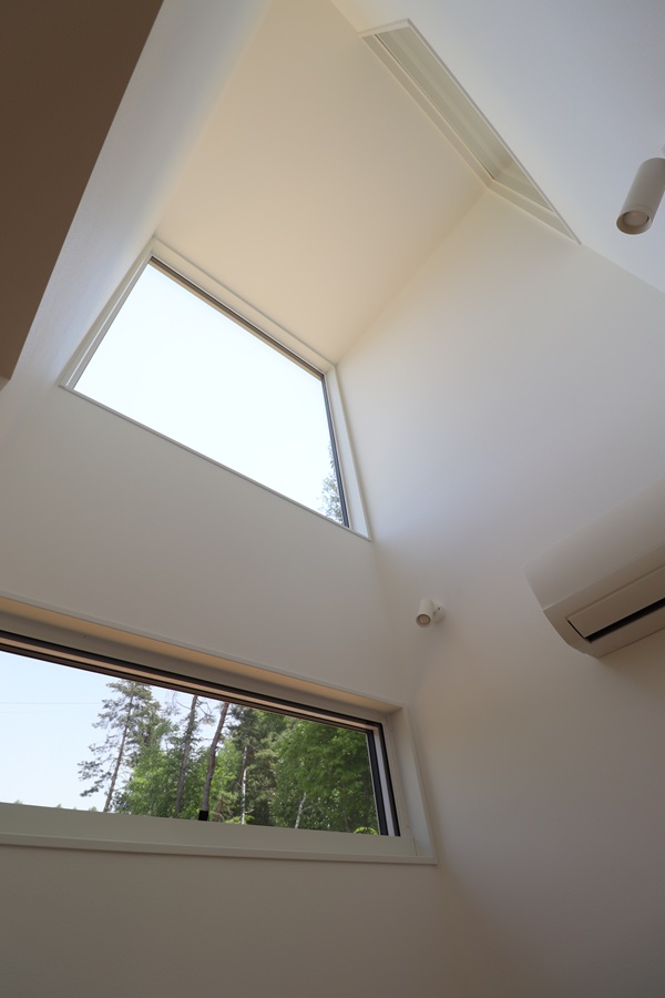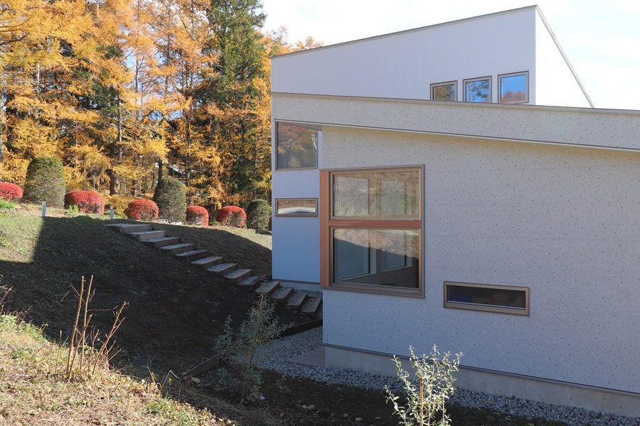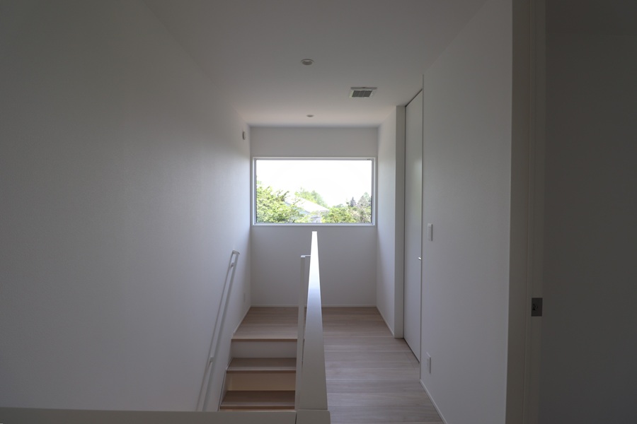 ガラス工房&ショップの店舗併用住宅です。 住宅部分は、直線的でボリューム感のある2階建ての構成です。 平屋の店舗部分が、建物のデザインにリズムを与えています。 造作や既製品をうまく組み合わせたシンプルでスッキリデザインのお家です。 【LDK】 空間全体は、白を基調とした明るい木目のフロアで統一され、連続窓が広がりを感じさせます。 奥にはキッチンとダイニングスペースが配置されており、アイランド型のキッチンカウンターがリビングとの緩やかな仕切りとなっています。 オールステンレスのキッチンは、清潔感があり洗練された印象を与えます。 【スタディスペース】 吹き抜けと高窓から降り注ぐ自然光を最大限に活用し、シンプルで温かみのある素材で仕上げています。 宿題やPC作業などが行える多目的な空間です。 【2階仕事部屋】 部屋の壁一面に渡って、L字型のカウンターデスクを設置しました。 広いワークスペースは、PC作業や書類整理など、複数の作業を同時に行うことができ、デスク周りを常にすっきりと保てます。 デスクの正面には、横長の連続窓を配置し、目線と同じ高さに外部の豊かな緑や遠くの景色を取り込み、作業の合間にリフレッシュできる開放的な眺望を確保しました。