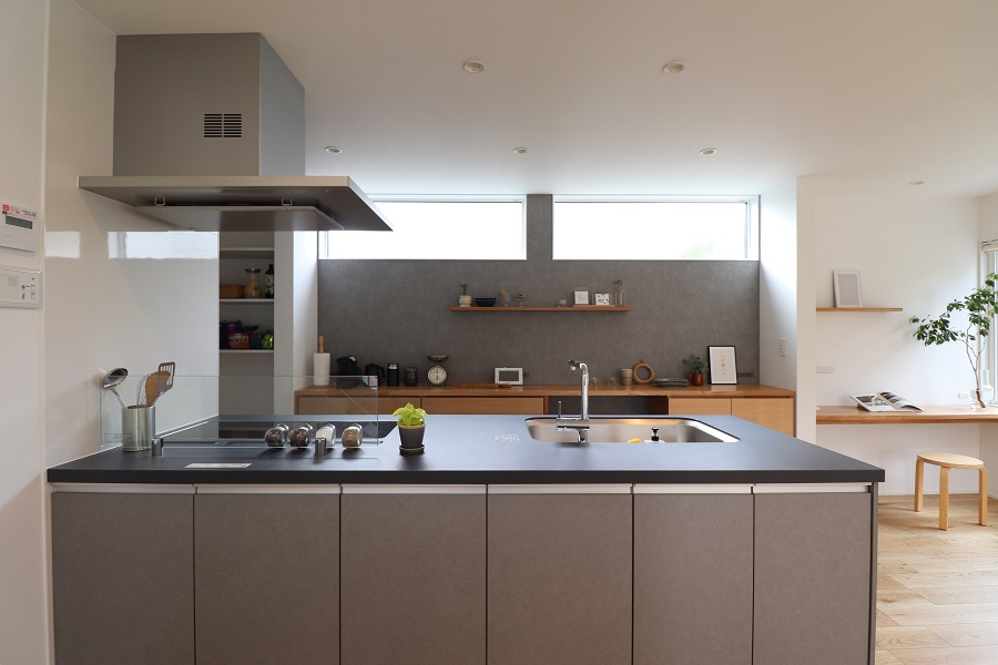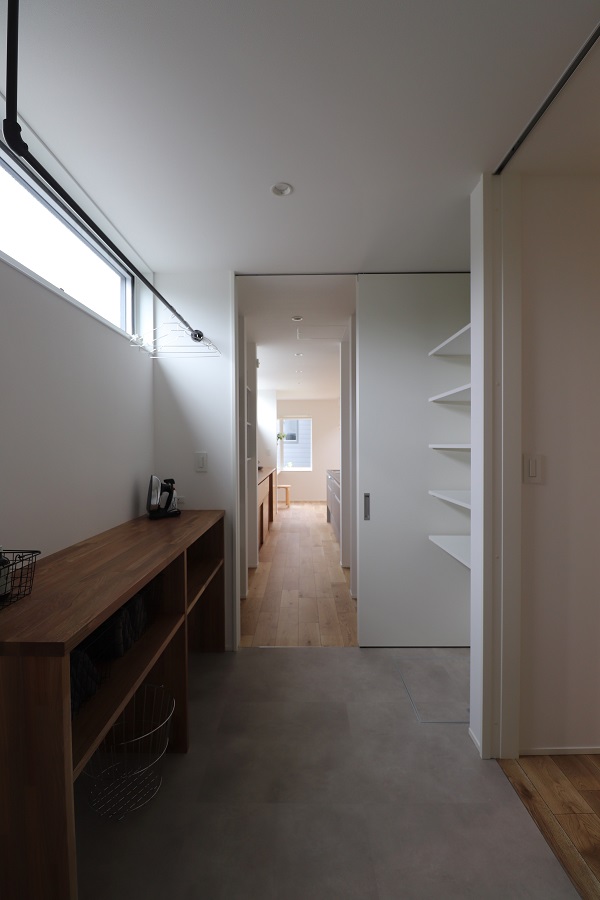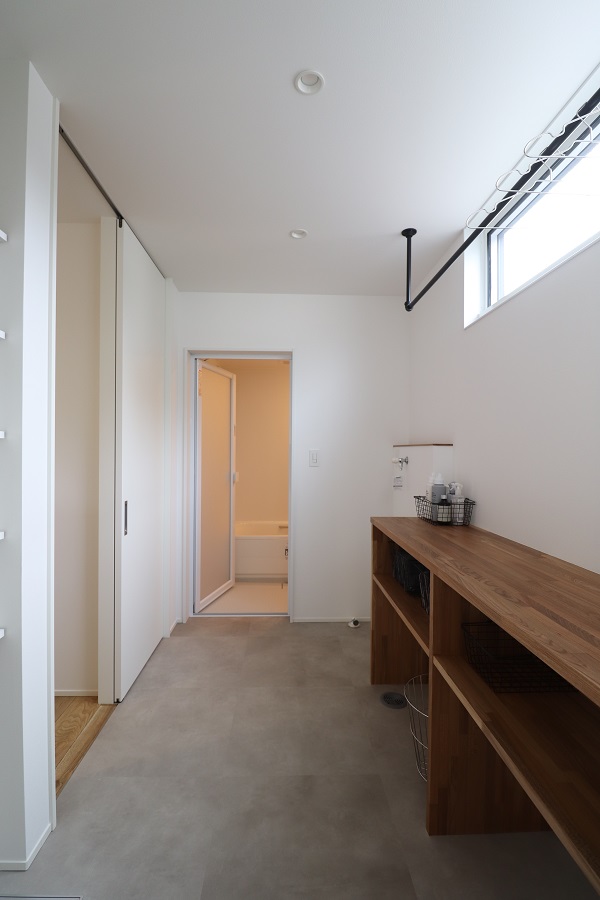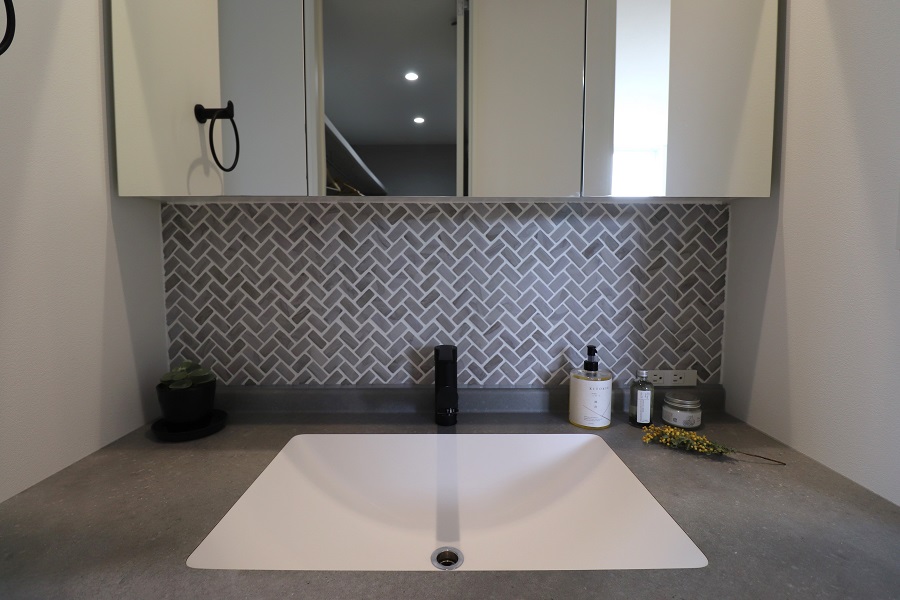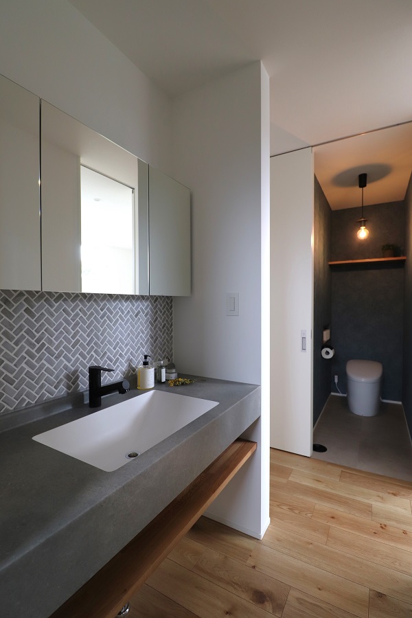 【水まわり】落ち着いたグレーを基調とし、回遊動線をともなったストレスフリーの家事動線。