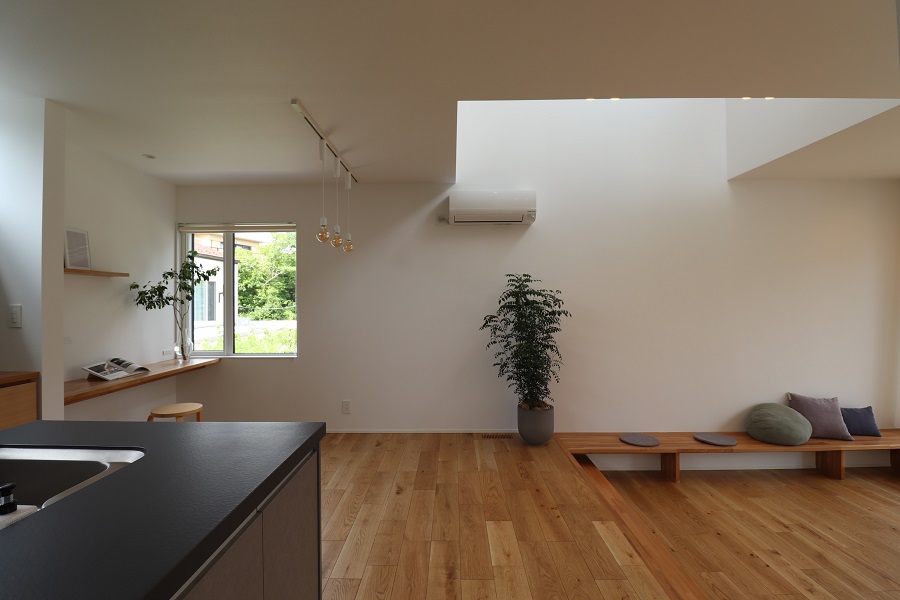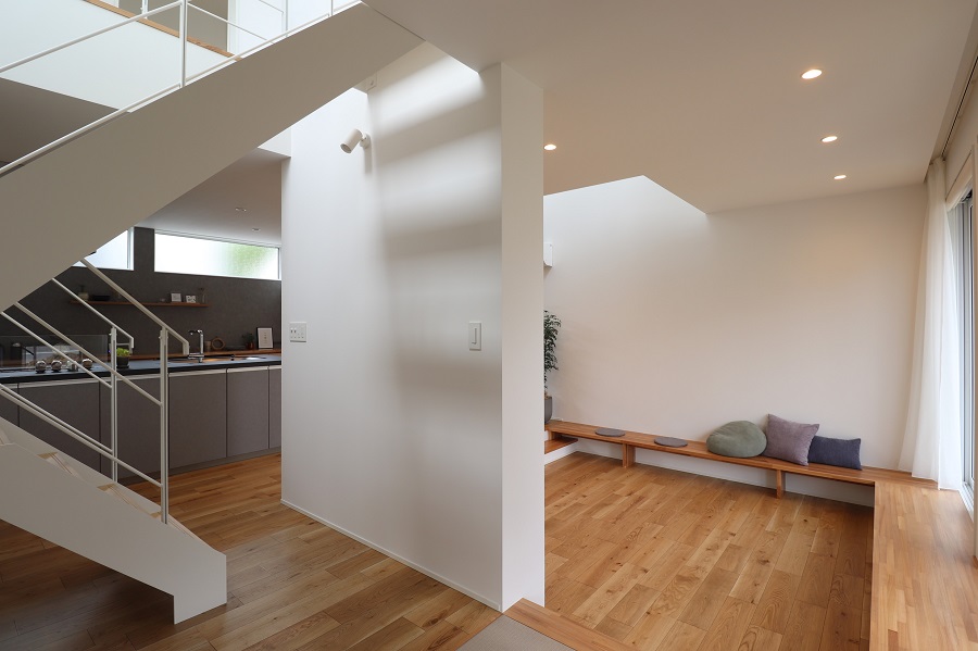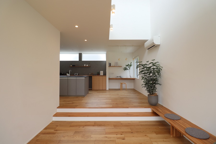 LDKは床の高低差を活かした構成となっており、シーンに合わせた居場所を自然に生み出しています。