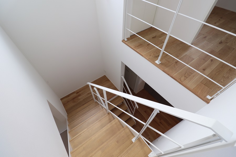 【階段】家の中心にあるオープン階段は、視線を遮らず上下階をゆるやかにつなぐシンボル的存在。