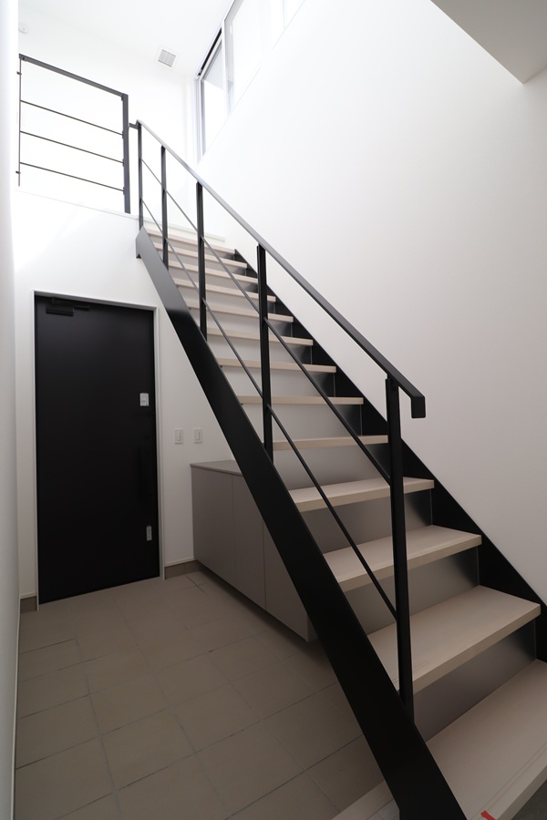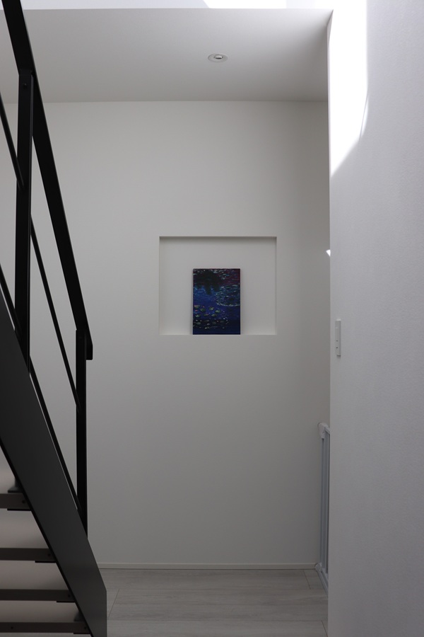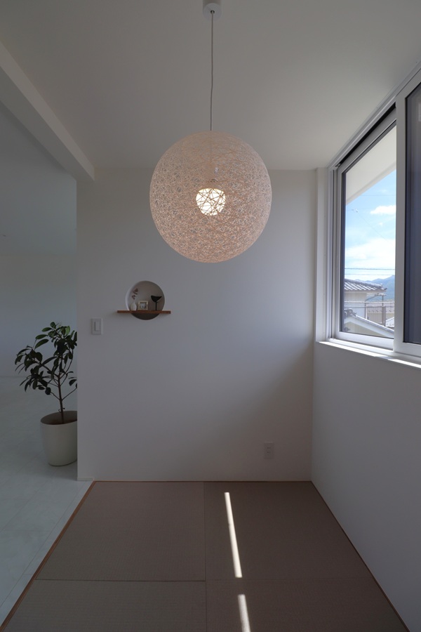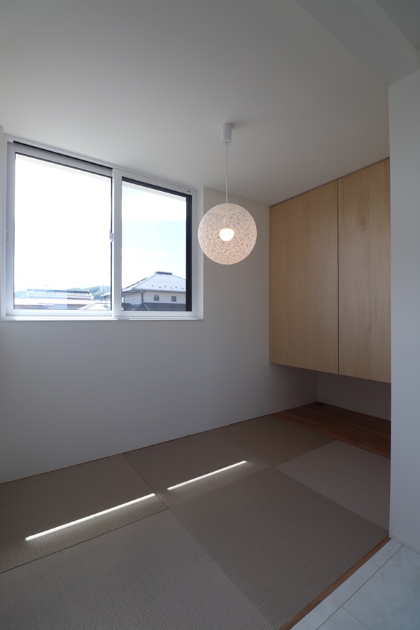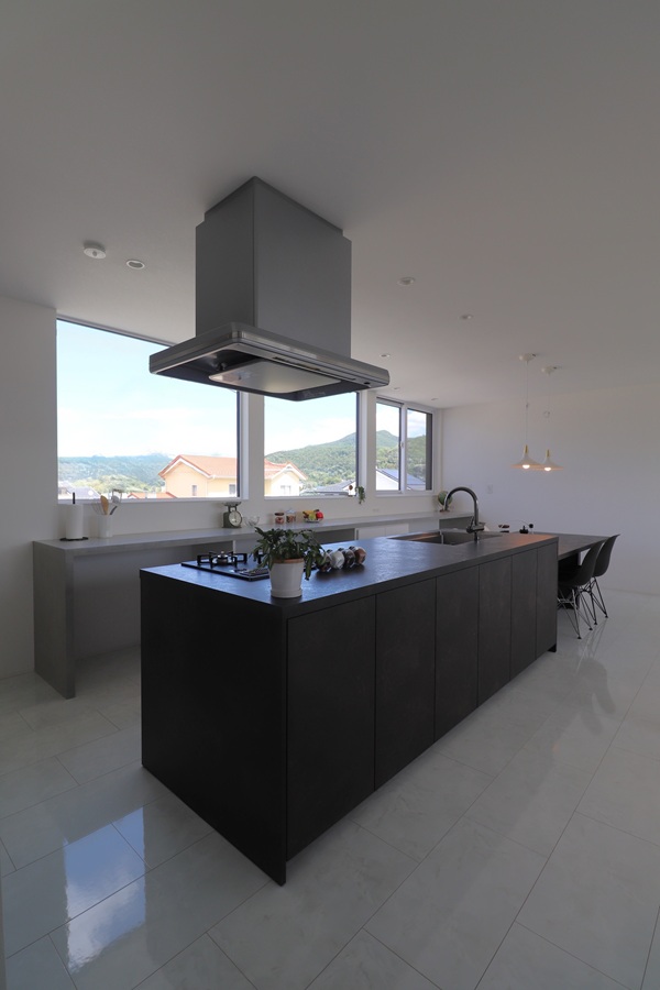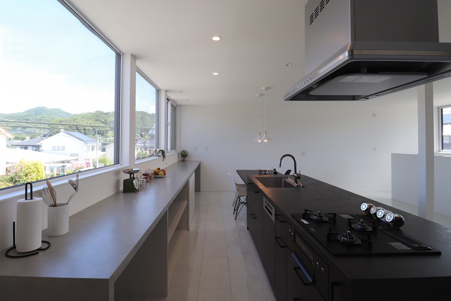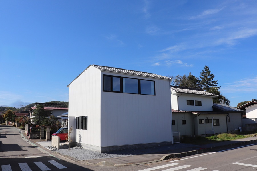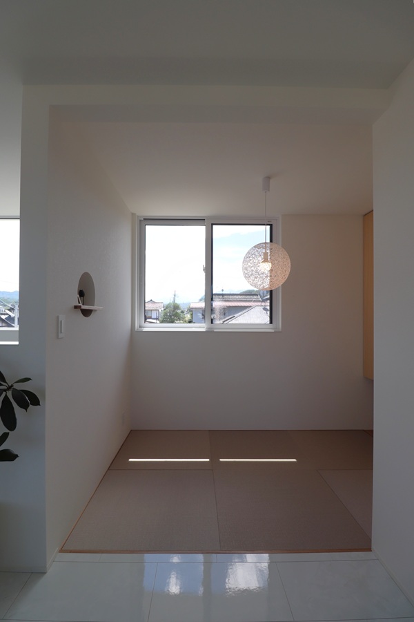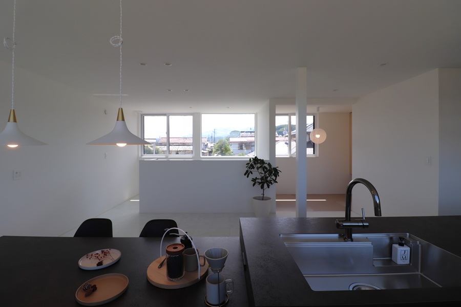 2方向が道路に接していることから、プライバシーの確保が求められました。 1階は居室以外の開口を極力制限し、二階リビングとすることで、通行人や車の視線を気にせずに開放的な暮らしを実現しました。 リビングには南北に水平連続窓を配し、ロケーション最優先とすることで、自然光が差し込み明るく心地よい空間が広がっています。 【外観】 周辺の建物および山々との調和(連続性)から山形の切妻としました。 シンプルで洗練されたデザインです。 【玄関】 玄関を入ると、目を引くのはスタイリッシュな鉄骨階段。 光を通すデザインが、空間に抜け感と広がりを生み出しています。 【リビング】 廊下や扉を極力おさえ、ひとつながりの空間とすることで、視覚的効果だけではなく、実質的にも広い空間としました。 白を基調としたインテリアの中に、ダークトーンのキッチンが美しく映えます。 艶のある床材が、ホテルライクな雰囲気を演出。 外の景色を楽しみながら家族が集える、心地よい空間です。 【畳スペース】 リビングの一角に設けた畳スペースは、やわらかな光が差し込む癒しの空間です。 読書や昼寝、子どもの遊び場など、多目的に使える心地よい場所です。 吊り収納で足元をすっきりと見せ、空間の広がりを感じられる設計に。 モダンなリビングと調和する、シンプルで上品な和のしつらえです。