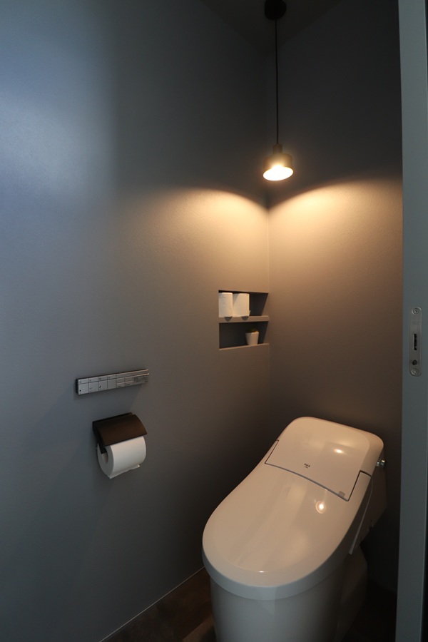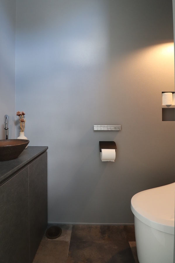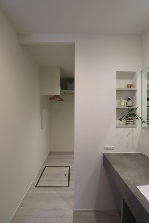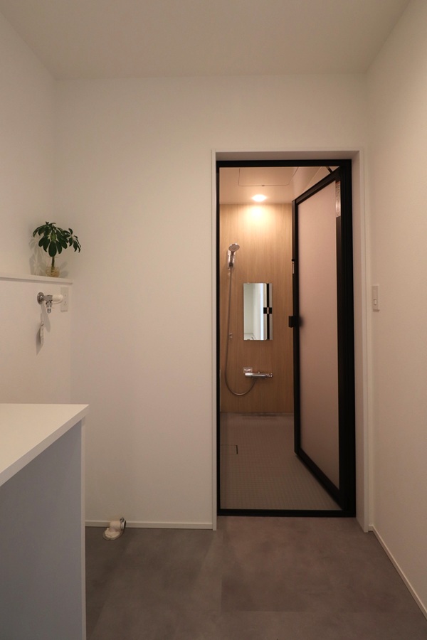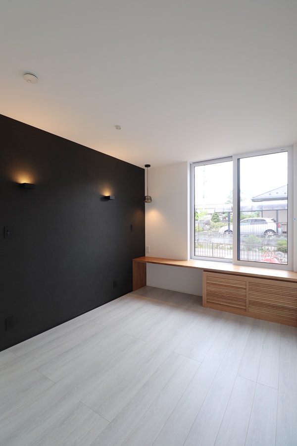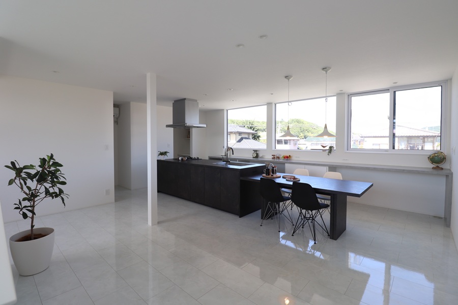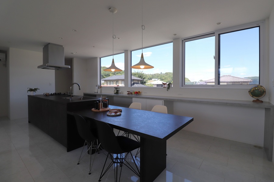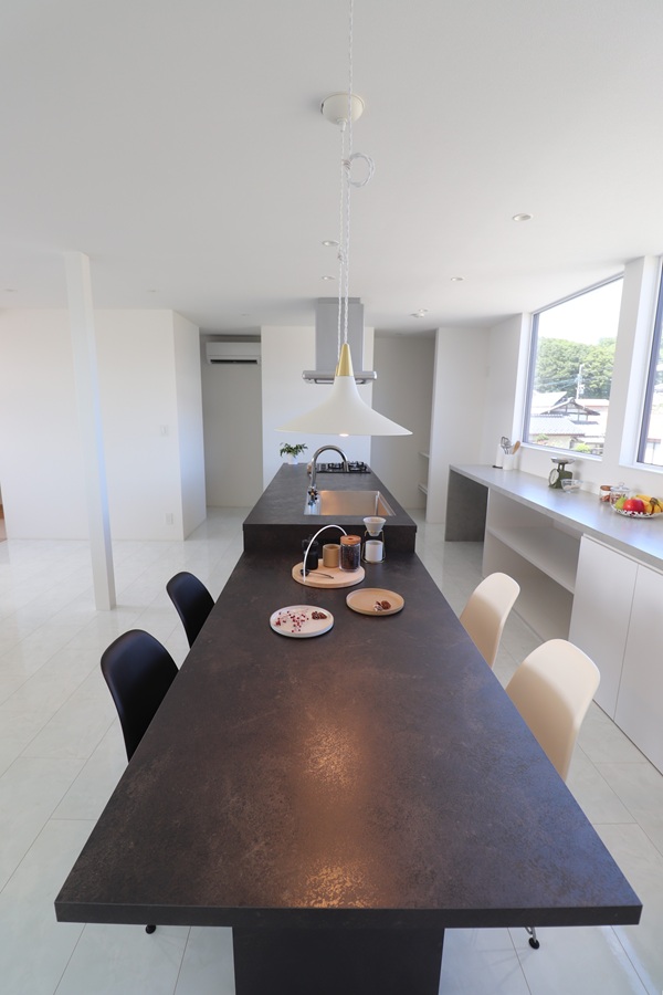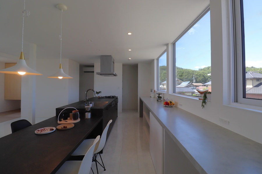 2方向が道路に接していることから、プライバシーの確保が求められました。 1階は居室以外の開口を極力制限し、二階リビングとすることで、通行人や車の視線を気にせずに開放的な暮らしを実現しました。 リビングには南北に水平連続窓を配し、ロケーション最優先とすることで、自然光が差し込み明るく心地よい空間が広がっています。 【外観】 周辺の建物および山々との調和(連続性)から山形の切妻としました。 シンプルで洗練されたデザインです。 【玄関】 玄関を入ると、目を引くのはスタイリッシュな鉄骨階段。 光を通すデザインが、空間に抜け感と広がりを生み出しています。 【リビング】 廊下や扉を極力おさえ、ひとつながりの空間とすることで、視覚的効果だけではなく、実質的にも広い空間としました。 白を基調としたインテリアの中に、ダークトーンのキッチンが美しく映えます。 艶のある床材が、ホテルライクな雰囲気を演出。 外の景色を楽しみながら家族が集える、心地よい空間です。 【畳スペース】 リビングの一角に設けた畳スペースは、やわらかな光が差し込む癒しの空間です。 読書や昼寝、子どもの遊び場など、多目的に使える心地よい場所です。 吊り収納で足元をすっきりと見せ、空間の広がりを感じられる設計に。 モダンなリビングと調和する、シンプルで上品な和のしつらえです。